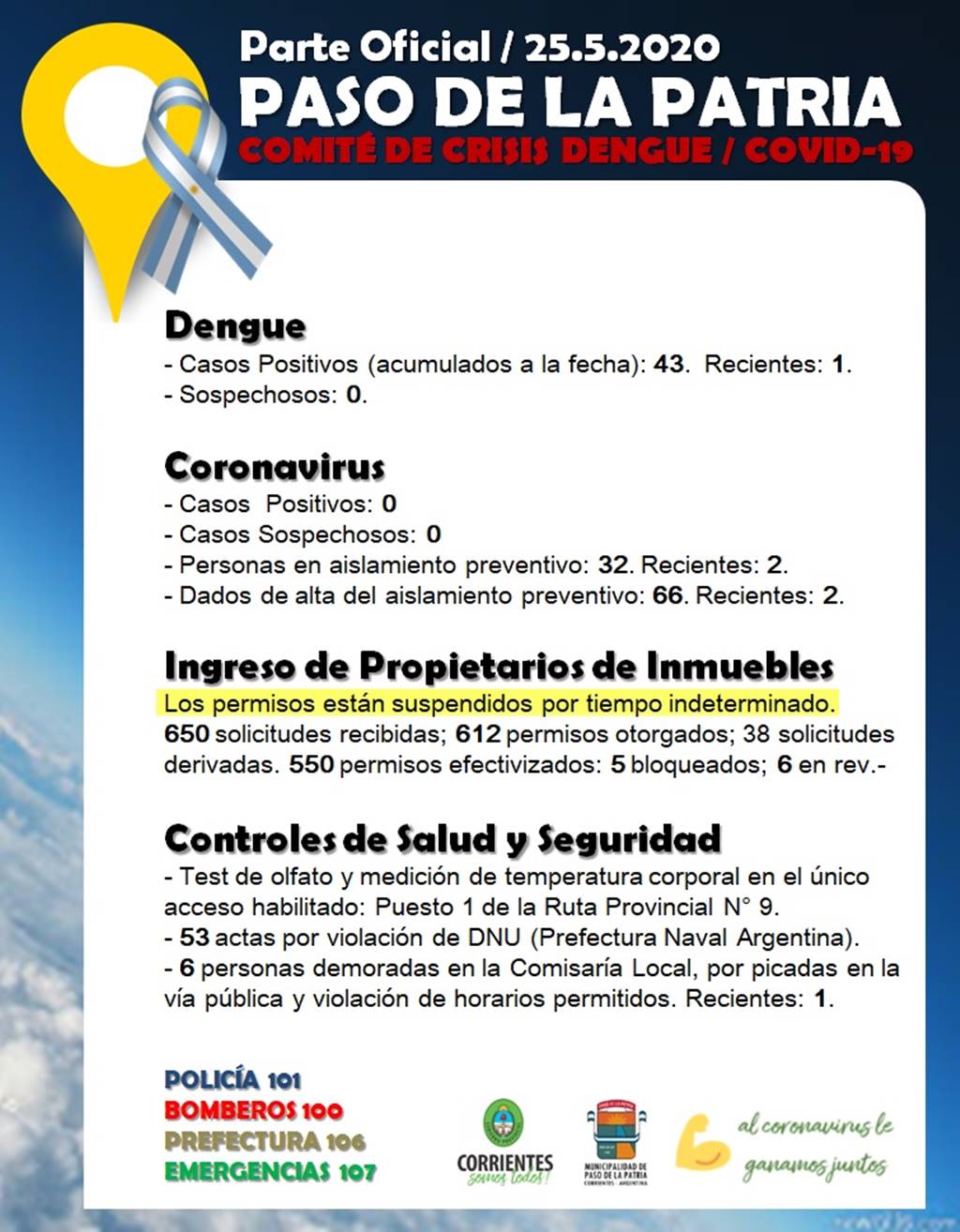 El Comité de Crisis de Paso de la Patria difundió el siguiente parte sobre Dengue y Coronavirus en la localidad.