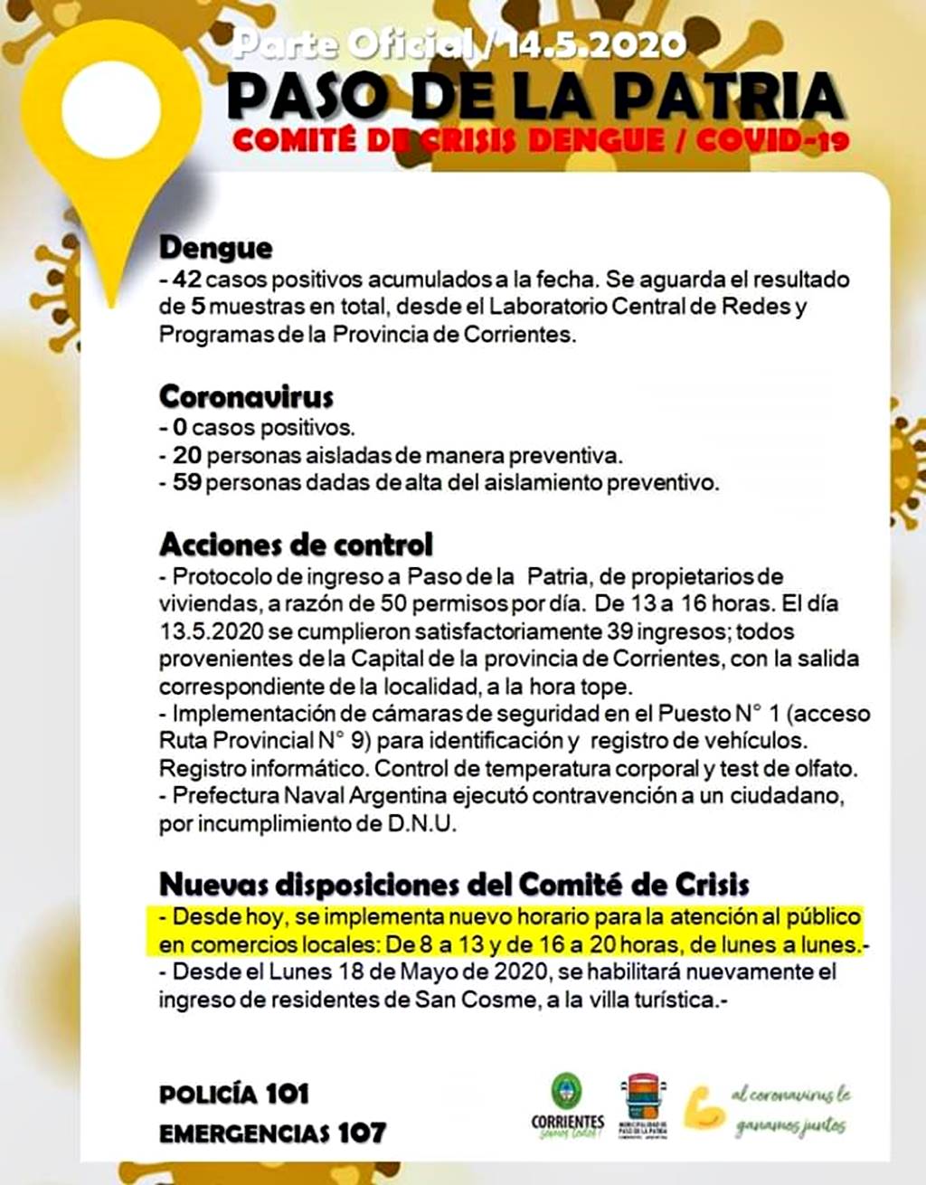 El Comité de Crisis Dengue / Coronavirus Covid-19 de Paso de la Patria, integrada por Municipalidad de Paso de la Patria, Gendarmería Nacional, Prefectura Naval Argentina, Policía de la Provincia, Bomberos Voluntarios y Hospital Dr. Eduardo A. Cicconetti, presidida por el Intendente Guillermo Osnaghi, Dispuso la extensión del horario de atención comercial a partir de la fecha, será de 08 a 13 y de 16 a 20 horas.