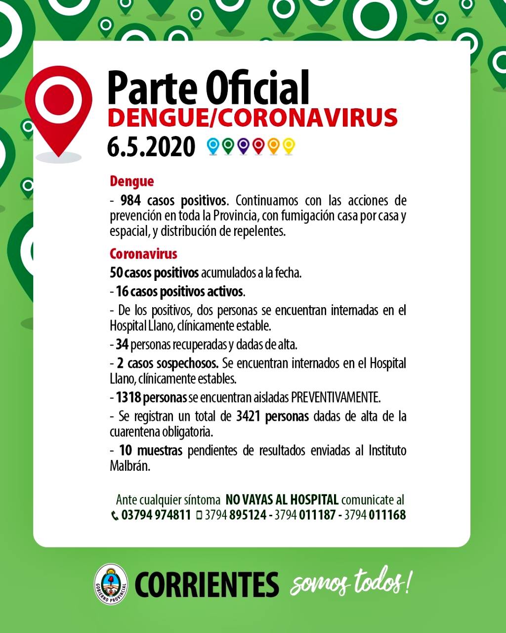 No se registran casos positivos nuevos de Coronavirus-COVID 19 en el territorio provincial, por quinto día consecutivo, de esta manera se mantiene el acumulado en 50 casos, de los cuales 34 personas se recuperaron y fueron dadas de alta, 14 se mantienen aislados y en buen estado de salud, dos se encuentran internados, uno en sala de Terapia Intensiva y el otro en sala general del Hospital llano respectivamente, mostrándose ambos en condición clínica estable.