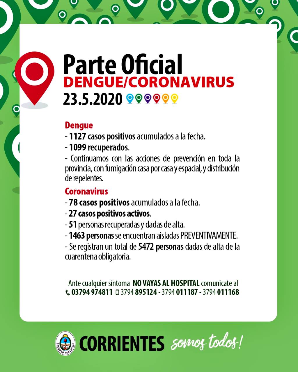 El Comité de Emergencia, destaca la buena situación epidemiológica que impera en Corrientes, lo que permite que al ingresar a una nueva fase de cuarentena regulada se puedan programar la liberación de nuevas actividades, las mismas serán anunciadas el próximo 25 de mayo por el gobernador Gustavo Valdés. De tal manera reiteran la necesidad de cumplir estrictamente con las medidas indicadas para protegerse al salir a calle, usando el Barbijo, manteniendo la distancia con otras personas, no generar aglomeraciones y respetar las medidas de higiene dispuestas por la autoridad sanitaria.