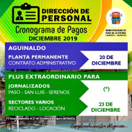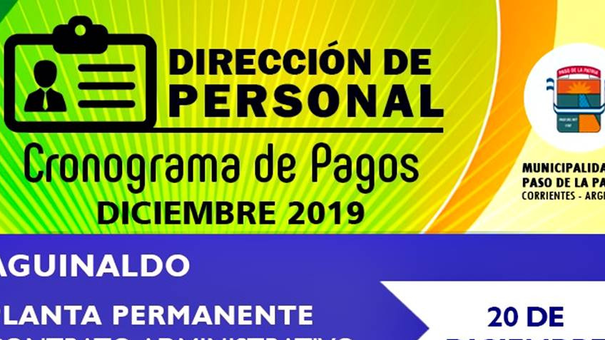 La intendencia municipal de Paso de la Patria informa que, a partir del viernes 20 de diciembre de 2019, comienza el pago del sueldo anual complementario (aguinaldo) de diciembre 2019 a los empleados públicos municipales.