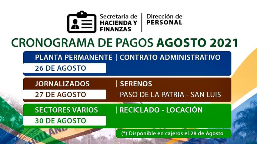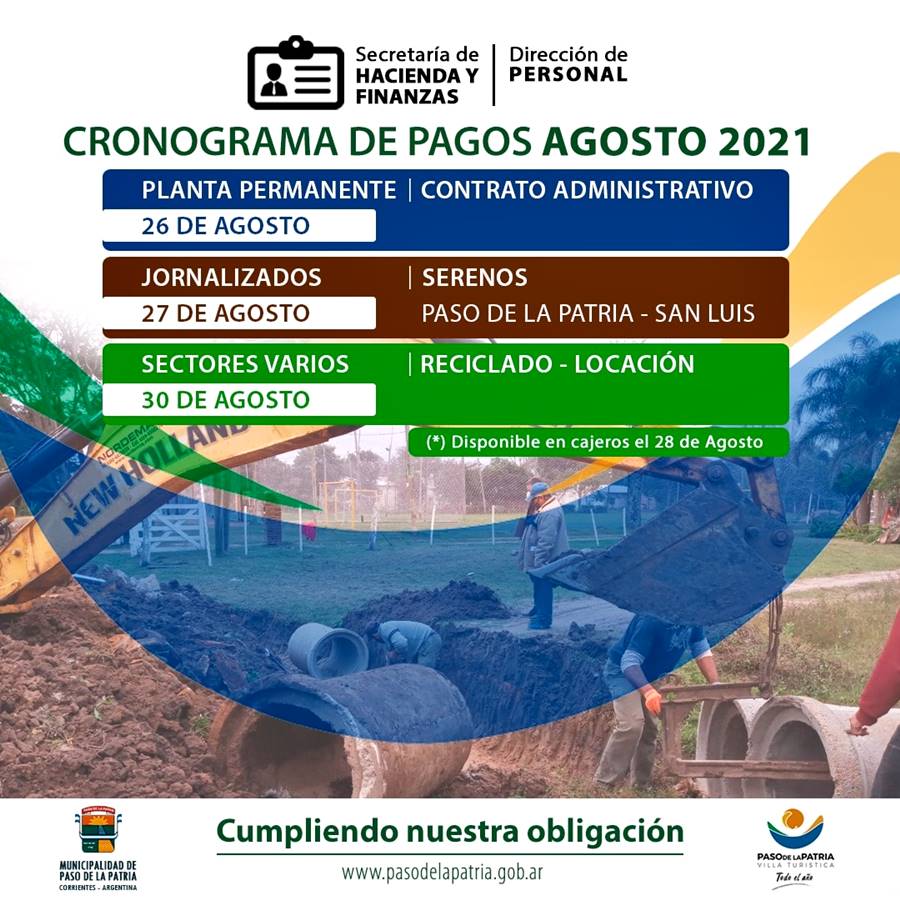 Los sueldos del personal municipal de Paso de la Patria correspondientes al mes de agosto se pagarán desde el día jueves 26 de agosto. Como es habitual, antes de finalizar el mes.