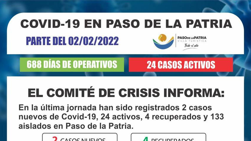 En las últimas 24 horas han sido registrados dos (2) casos nuevos de Covid-19, cuatro (4) recuperados, veinticuatro (24) casos activos y ciento treinta y tres (133) personas están aisladas preventivamente en Paso de la Patria.