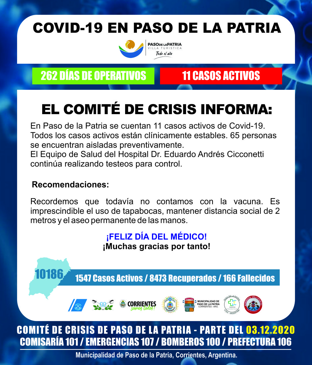 El parte epidemiológico del Comité de Crisis de Paso de la Patria da cuenta que al cabo de las últimas 24 horas se cuentan 11 casos activos de Covid-19 en la localidad.