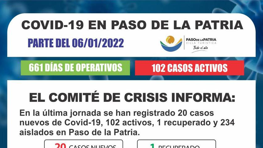 En las últimas 24 horas se han registrado veinte (20) casos nuevos de Covid-19, uno (1) recuperado, ciento dos (102) casos activos y doscientos treinta y cuatro (234) personas están aisladas preventivamente en Paso de la Patria.
