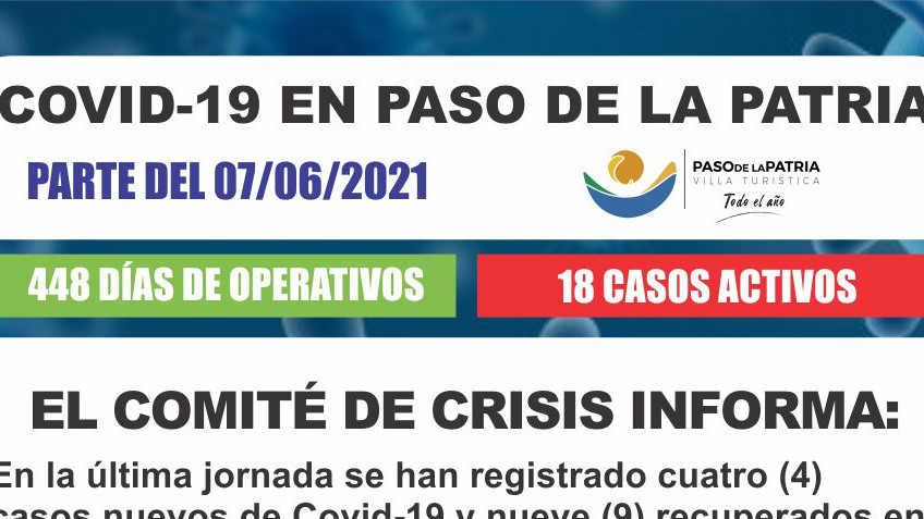 En la última jornada se han registrado cuatro (4) casos nuevos de Covid-19 y nueve (9) recuperados en Paso de la Patria.
