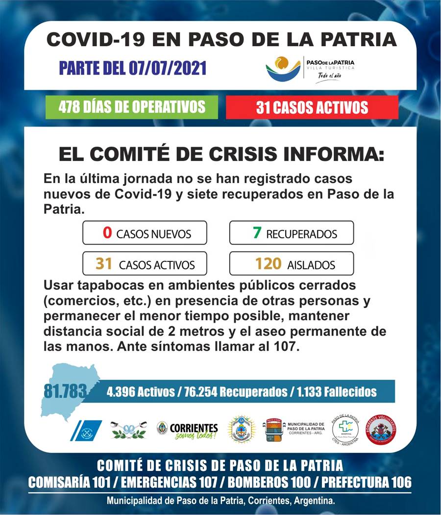 En la última jornada no se han registrado casos nuevos de Covid-19 y siete (7) recuperados en Paso de la Patria.