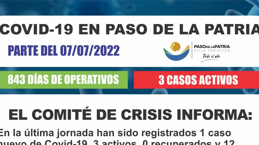 En las últimas 24 horas han sido registrados un (1) caso nuevo de Covid-19, cero (0) recuperados, tres (3) casos activos y doce (12) personas aisladas preventivamente en Paso de la Patria.