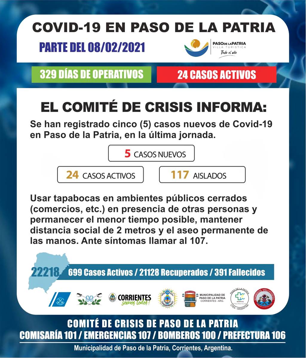 En la última jornada se han registrado cinco (5) casos nuevos de Covid-19 en Paso de la Patria.