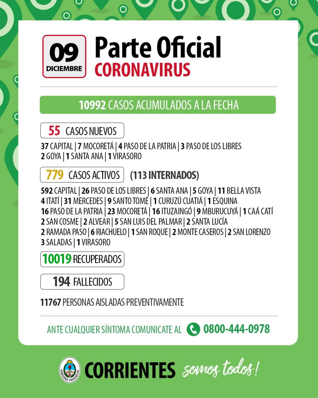 A la fecha de este miércoles 09 de diciembre se han registrado cuatro (4) nuevos casos de Covid-19 en las últimas 24 horas, en Paso de la Patria.