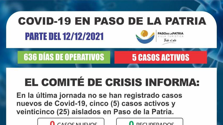 En la última jornada no se han registrado casos nuevos de Covid-19, cinco (5) casos activos y veinticinco (25) personas están aisladas preventivamente en Paso de la Patria.