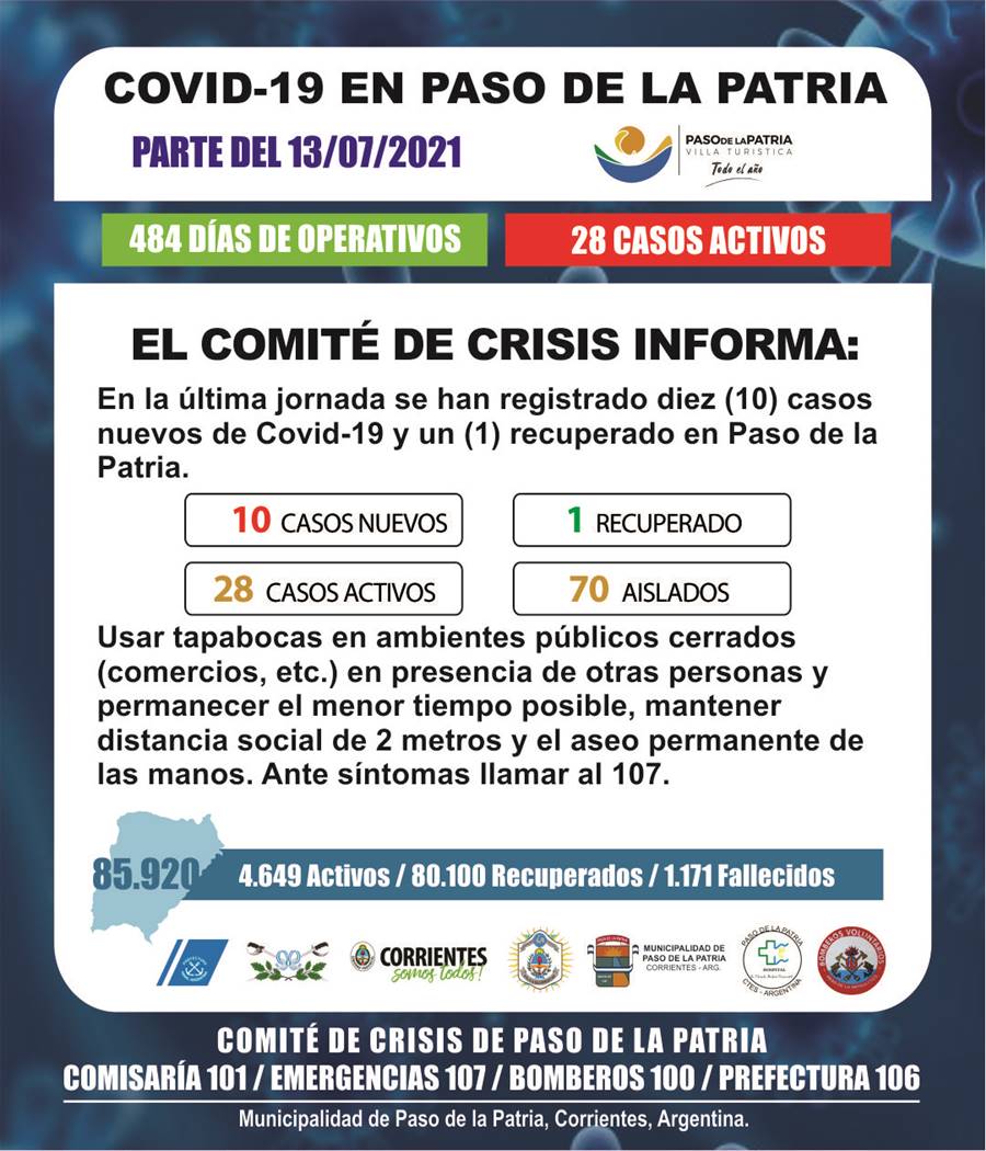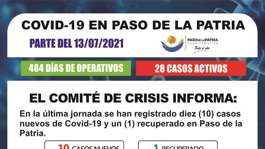 En la última jornada se han registrado diez (10) casos nuevos de Covid-19 y un (1) recuperado en Paso de la Patria.