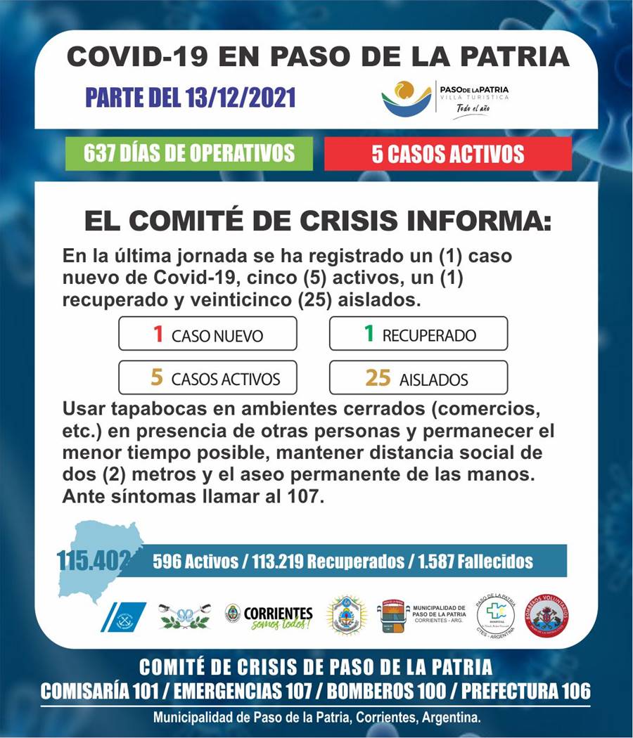 En las últimas 24 horas se ha registrado un (1) caso nuevo de Covid-19, un (1) recuperado, cinco (5) casos activos y veinticinco (25) personas están aisladas preventivamente en Paso de la Patria.