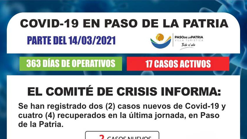 En la última jornada se han registrado dos (2) casos nuevos de Covid-19 y cuatro (4) recuperados en Paso de la Patria.