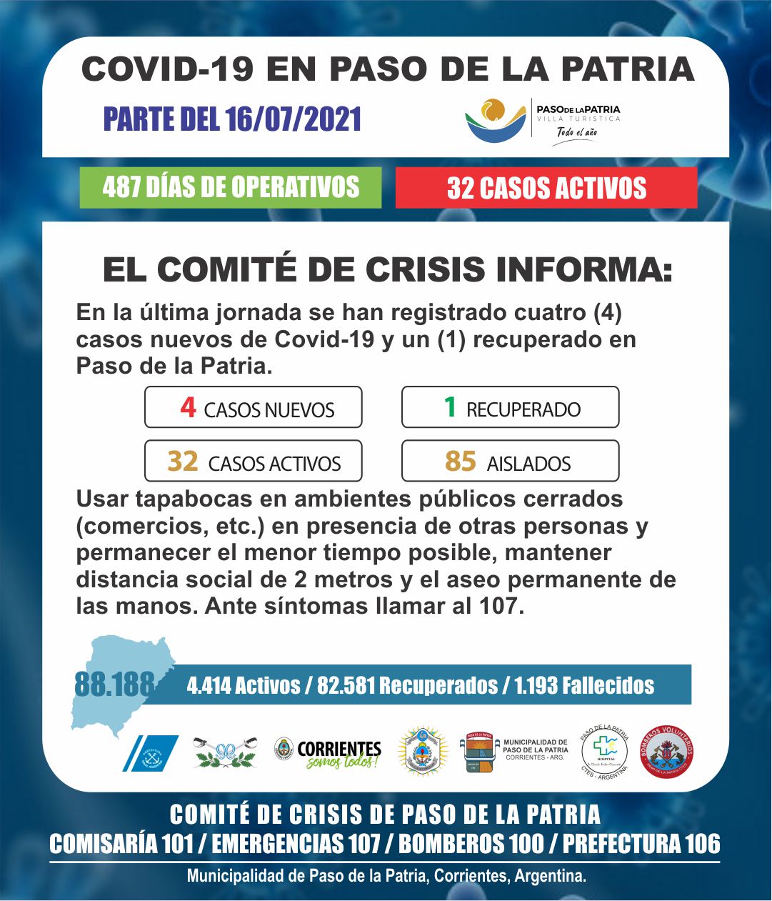 En la última jornada se han registrado cuatro (4) casos nuevos de Covid-19 y un (1) recuperado en Paso de la Patria.