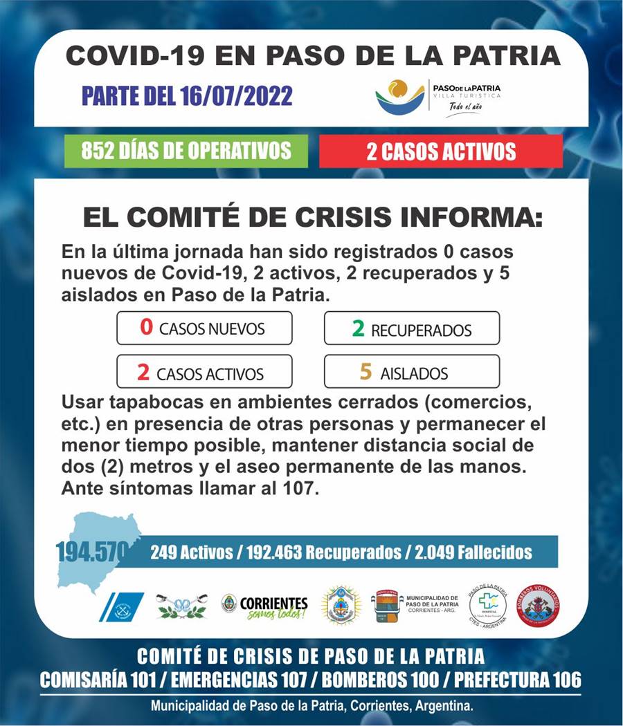 - Debemos actuar con total responsabilidad. Es aconsejable el uso de tapabocas, mantener distancia social de 2 metros y el aseo permanente de las manos. Ante cualquier síntoma llamar al 107. Sugerencias del Comité de Crisis de Paso de la Patria.