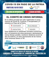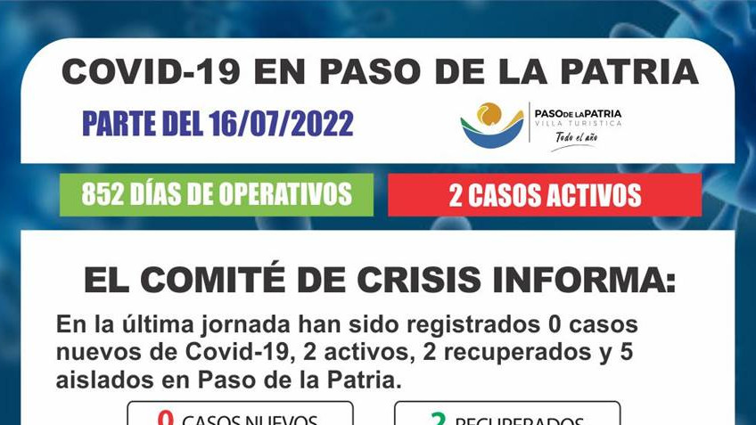 En las últimas 24 horas han sido registrados cero (0) caso nuevo de Covid-19, dos (2) recuperados, dos (2) casos activos y cinco (5) personas aisladas preventivamente en Paso de la Patria.