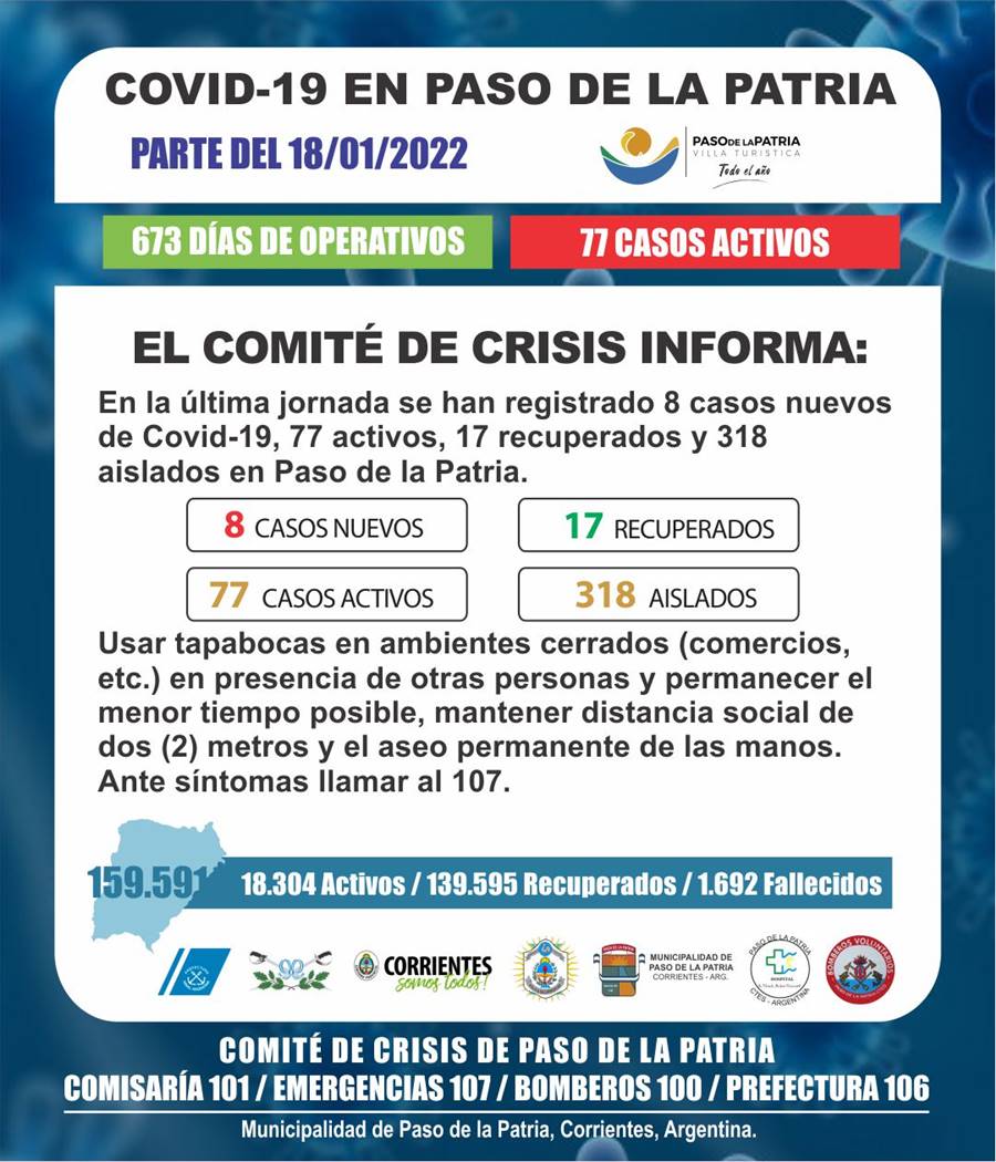 En las últimas 24 horas se han registrado ocho (8) casos nuevos de Covid-19, diecisiete (17) recuperados, setenta y siete (77) casos activos y trescientos dieciocho (318) personas están aisladas preventivamente en Paso de la Patria.