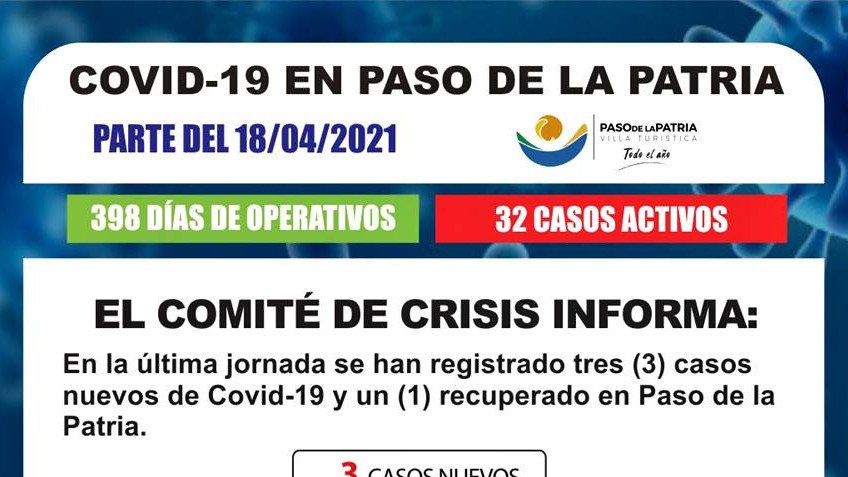 En la última jornada se han registrado tres (3) casos nuevos de Covid-19 y un recuperado en Paso de la Patria.