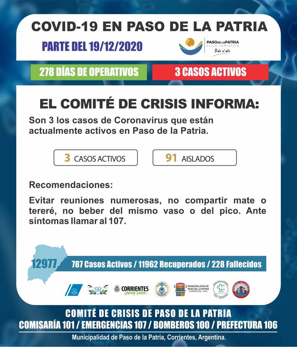 Al momento de la emisión de este informe hay 3 casos activos de Covid-19 en Paso de la Patria.