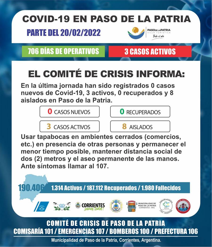 En las últimas 24 horas han sido registrados cero (0) caso nuevo de Covid-19, cero (0) recuperados, tres (3) casos activos y ocho (8) personas están aisladas preventivamente en Paso de la Patria.