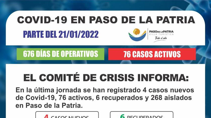 En las últimas 24 horas se han registrado cuatro (4) casos nuevos de Covid-19, seis (6) recuperados, setenta y seis (76) casos activos y doscientos sesenta y ocho (268) personas están aisladas preventivamente en Paso de la Patria.