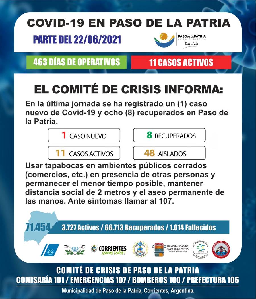 En la última jornada se ha registrado un (1) caso nuevo de Covid-19 y ocho (8) recuperados en Paso de la Patria.