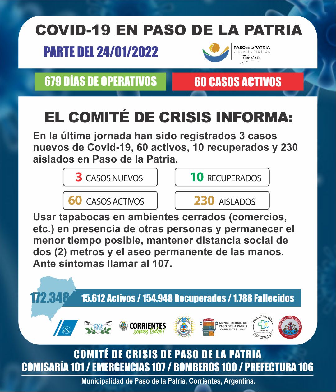 - Debemos actuar con total responsabilidad. Es imprescindible el uso de tapabocas, mantener distancia social de 2 metros y el aseo permanente de las manos. Ante cualquier síntoma llamar al 107. Sugerencias del Comité de Crisis de Paso de la Patria.