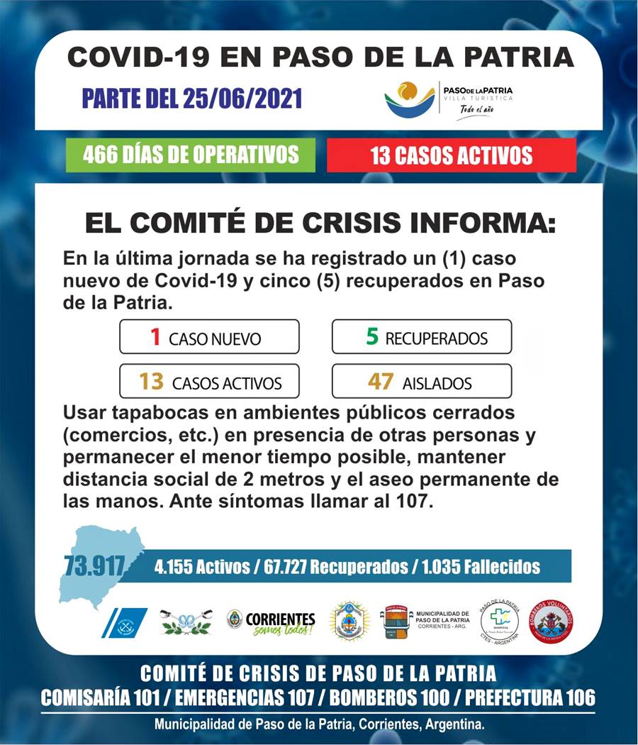 En la última jornada se ha registrado un (1) caso nuevo de Covid-19 y cinco (5) recuperados en Paso de la Patria.