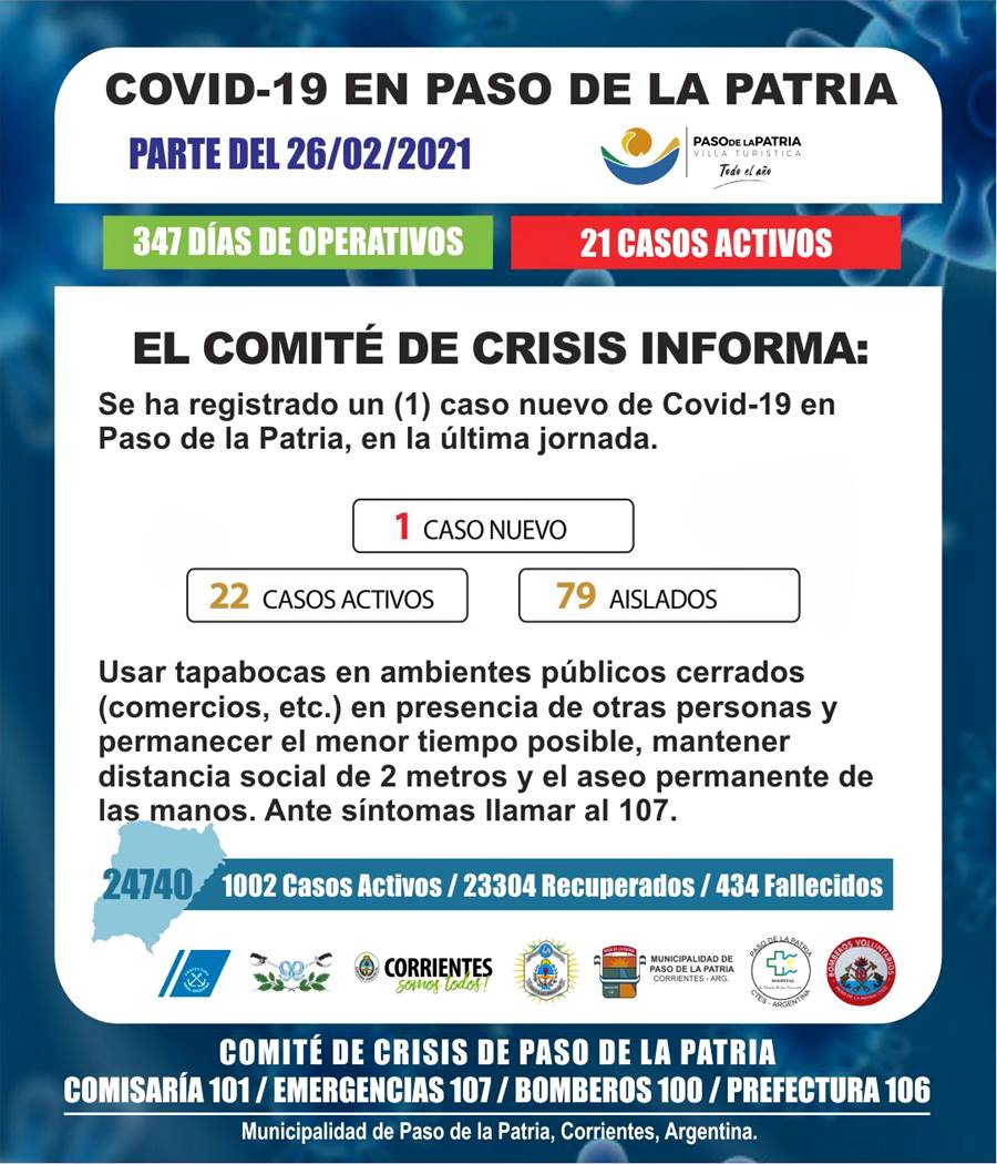 En la última jornada se ha registrado un (1) caso nuevo de Covid-19 en Paso de la Patria.