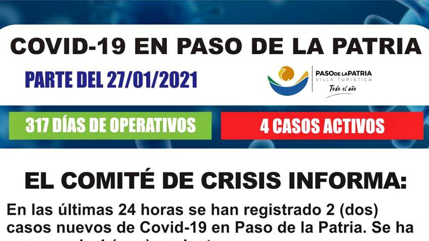 En las últimas 24 horas se han registrado dos (2) casos nuevos de Covid-19 en Paso de la Patria. Se ha recuperado un (1) paciente.