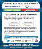 En las últimas 24 horas han sido registrados un (1) caso nuevo de Covid-19, cinco (5) recuperados, cinco (5) casos activos y once (11) personas aisladas preventivamente en Paso de la Patria.