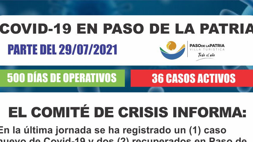 En la última jornada se ha registrado un (1) caso nuevo de Covid-19 y dos (2) recuperados en Paso de la Patria.