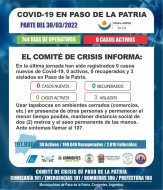 En las últimas 24 horas han sido registrados cero (0) casos nuevos de Covid-19, cero (0) recuperados, cero (0) casos activos y tres (3) personas están aisladas preventivamente en Paso de la Patria.