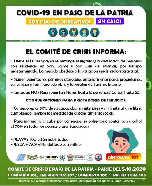 Desde este lunes 5 de octubre de 2020 se restringe el ingreso y la circulación de personas con residencia en San Cosme y San Luis del Palmar por tiempo indeterminado. La medida obedece a la situación epidemiológica actual.