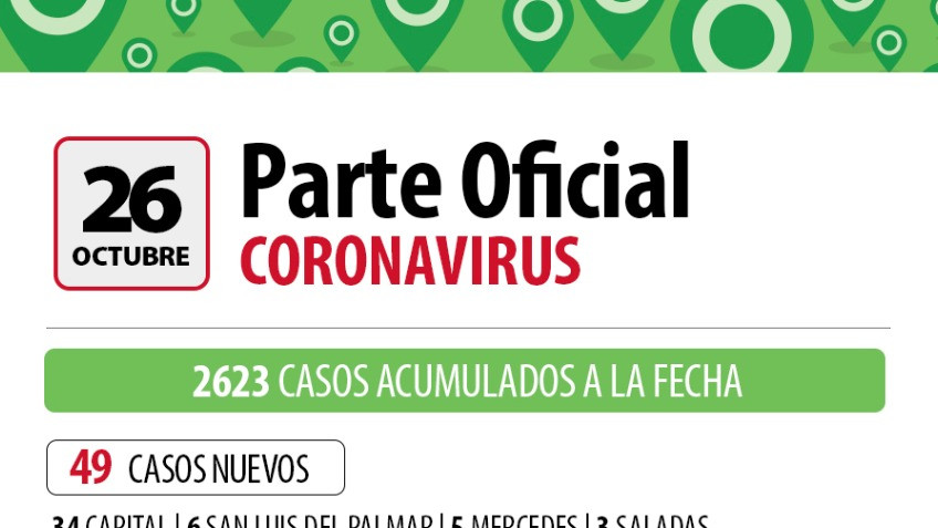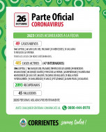 El informe epidemiológico del Comité de Crisis para el Coronavirus registra para este lunes 26 de octubre de 2020 un total de 49 nuevos contagios en la provincia de Corrientes.