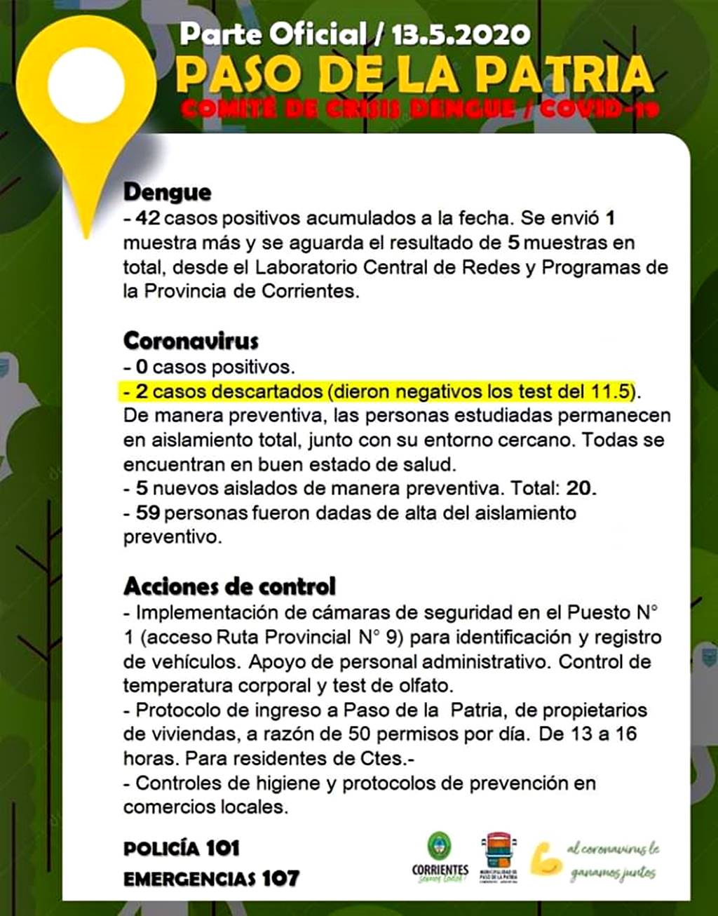 No hay casos positivos de Covid-19 en Paso de la Patria. Se descartaron dos posibles casos por dar test negativo.