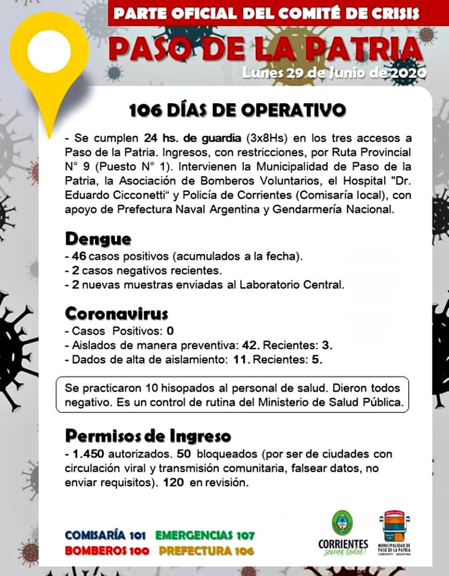 El abordaje territorial de la pandemia por Nuevo Coronavirus Covid-19 se desarrolla a nivel local gracias al trabajo conjunto de la Municipalidad de Paso de la Patria, la Asociación Bomberos Voluntarios, la Policía de Corrientes -Comisaría Local-, el Hospital Dr. Eduardo A. Cicconetti, Prefectura Naval Argentina y Gendarmería Nacional, nucleados en el Comité de Crisis.