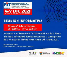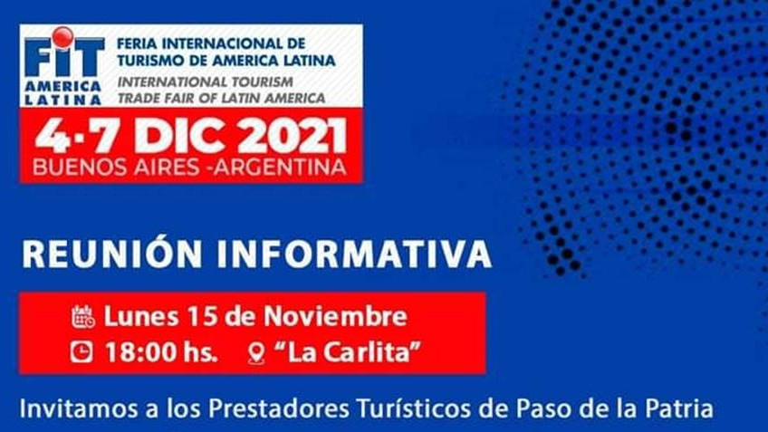 El lunes 15 de noviembre, desde las 18 horas, se realizará una reunión informativa en el patio interno de La Carlita (dependencia municipal, 25 de mayo entre Mendoza y Bolívar) para prestadores de servicios turísticos de Paso de la Patria, se trata de compartir datos e información para gestionar la participación en la Feria Internacional de Turismo que se realizará del 4 al 7 de diciembre en Buenos Aires.