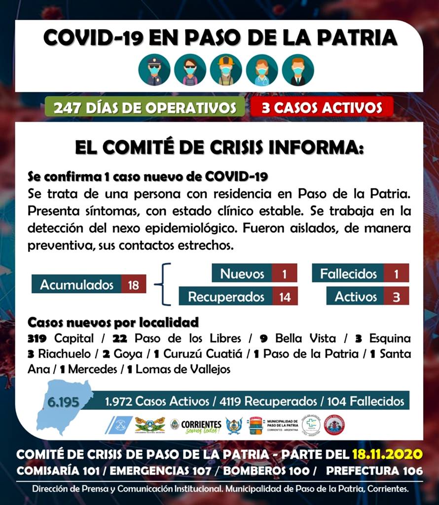 El Comité de Crisis de Paso de la Patria informa a la comunidad que en el día de la fecha se registra un nuevo caso positivo de COVID-19 en la villa turística. Se estudia el nexo epidemiológico y se aisló a los contactos estrechos.