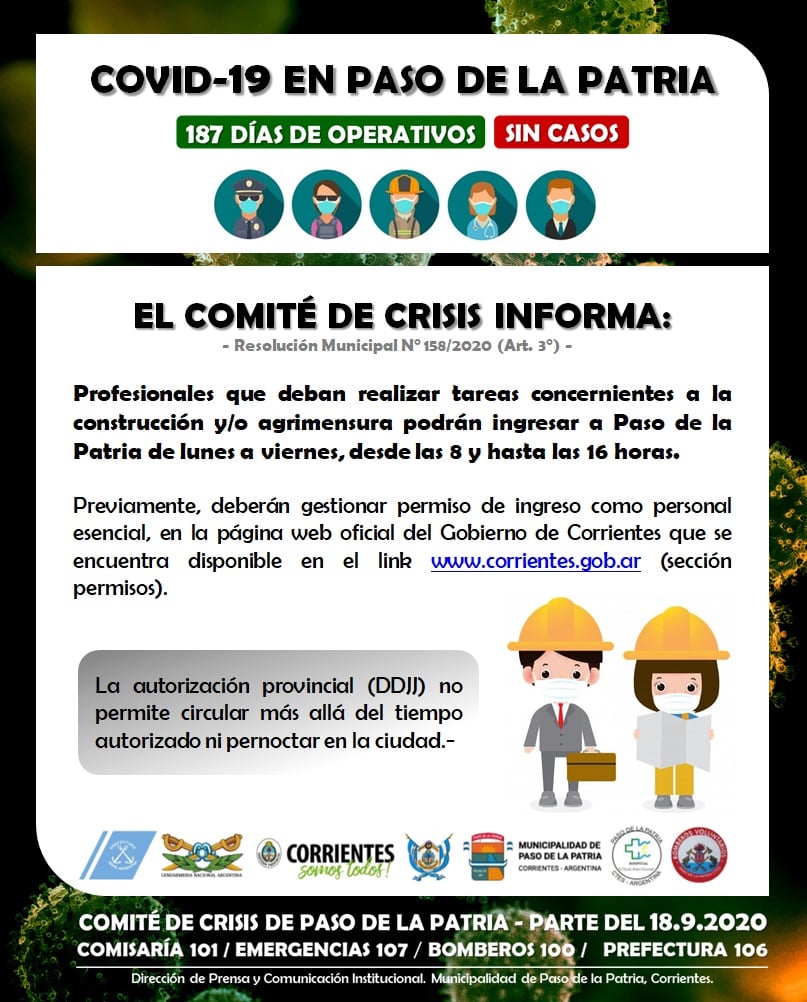 Los profesionales de la construcción y agrimensura pueden ingresar a Paso de la Patria con el fin de realizar sus tareas profesionales, los días lunes a viernes, en el horario de 8 a 16 horas.