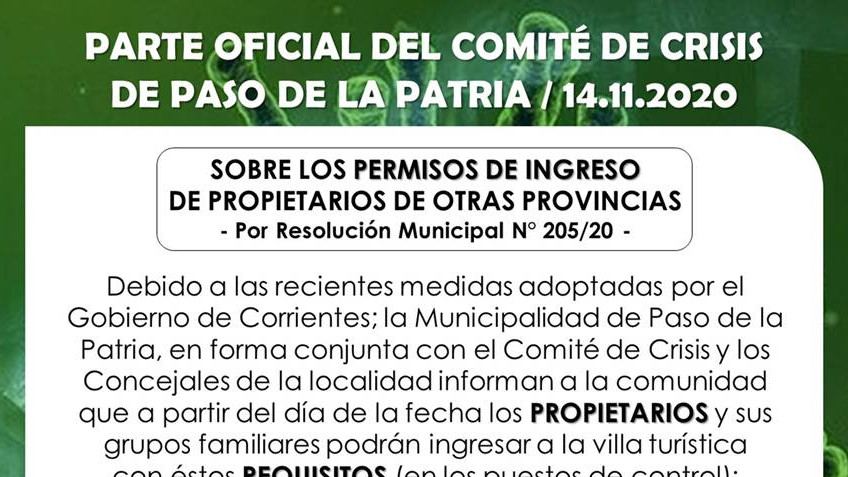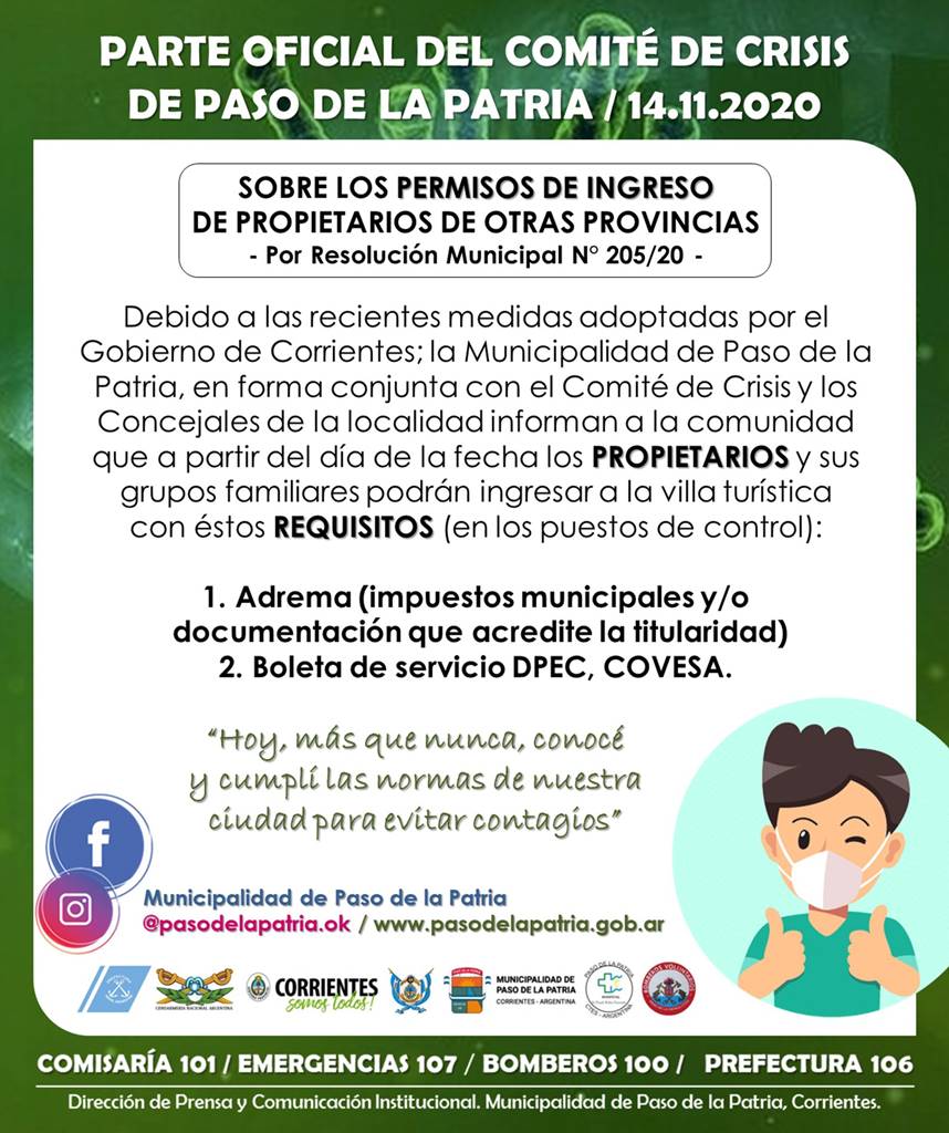 Conforme a las recientes medidas adoptadas por el gobierno de la provincia de Corrientes, la municipalidad de Paso de la Patria en conjunto con el Comité de Crisis y concejales dan cuenta que, a partir de hoy 14 de noviembre, los propietarios y sus grupos familiares podrán ingresar a la villa turística.