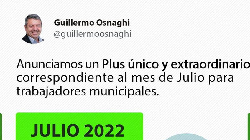 Osnaghi Instruyó a la secretaría de Hacienda y Finanzas y a la dirección de Personal para hacerlo efectivo. El mismo se pagará el 15 de julio de 2022.