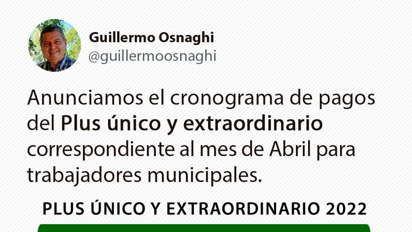 Conforme a la línea de trabajo establecida por el intendente Guillermo Osnaghi y de acuerdo a las posibilidades, el personal municipal recibe otro plus extraordinario.