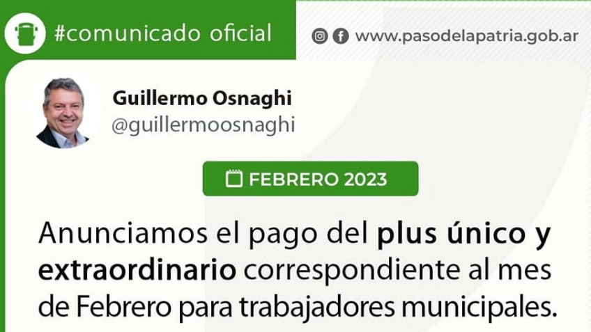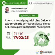 Plus Único Extraordinario para municipales en Paso de la Patria febrero 2023