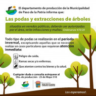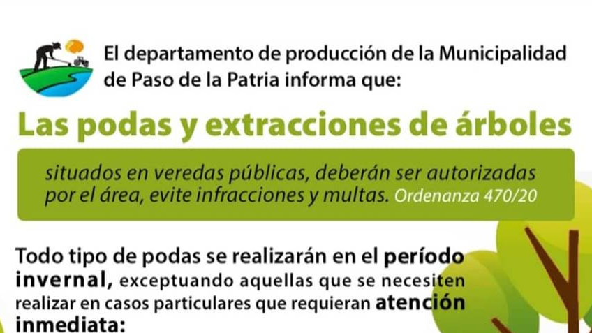 Las podas y extracciones de árboles que estuvieran en la vía pública, deberán ser autorizados por el área de Producción para evitar multas e infracciones, conforme a la Ordenanza 470/20.