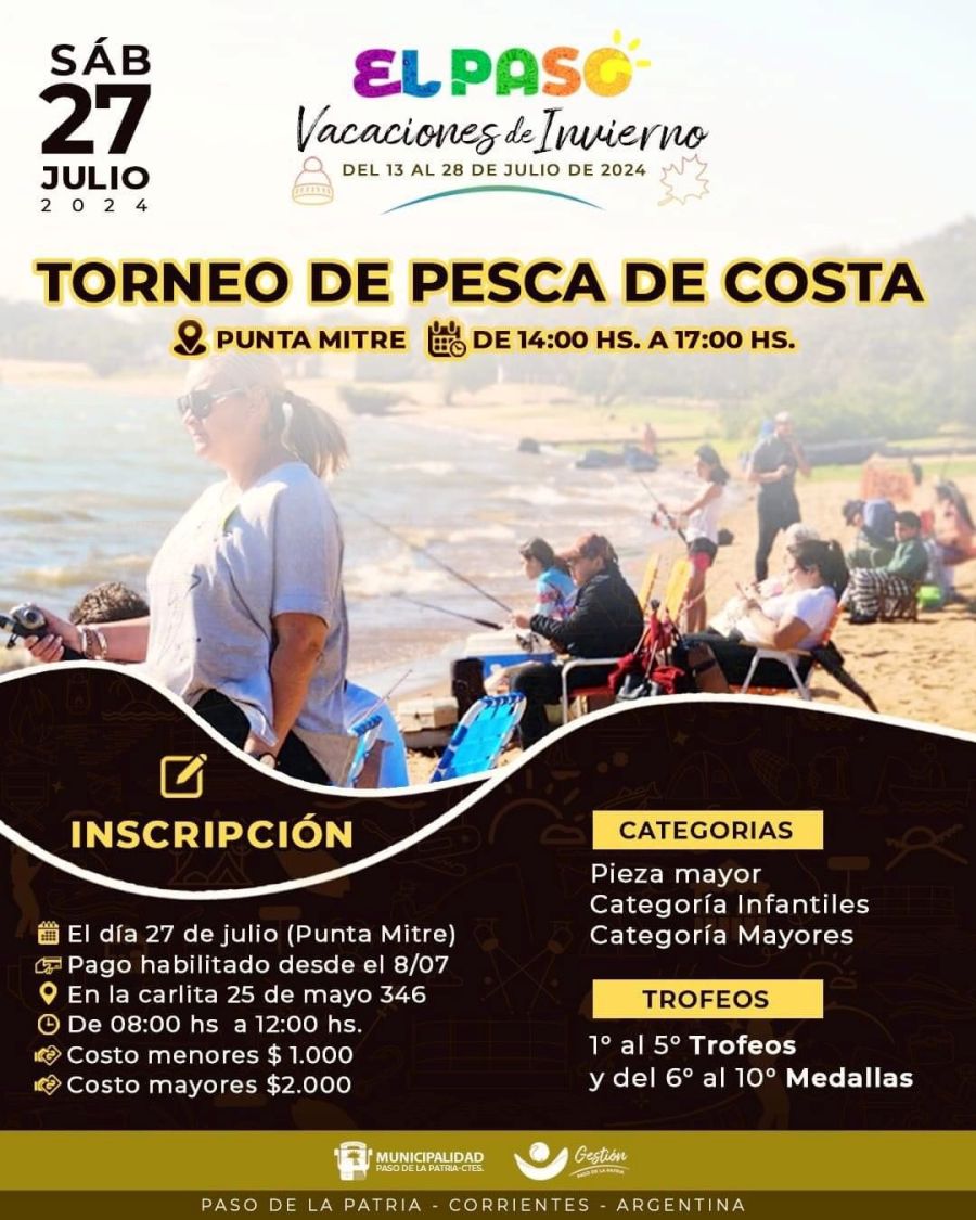 A partir de las 14:00 horas, los interesados podrán participar de un Torneo de Pesca de Costa con excelentes premios. Los participantes tendrán la oportunidad de demostrar sus habilidades y disfrutar de la belleza natural del Río Paraná.