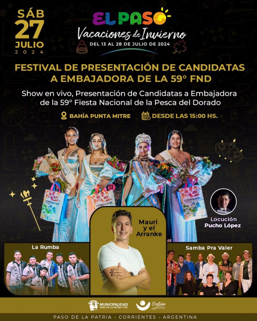 Este sábado, 27 de julio de 2024, Paso de la Patria celebra con gran entusiasmo la Presentación de Candidatas a Embajadora de la 59° Edición de la Fiesta Nacional de la Pesca del Dorado.