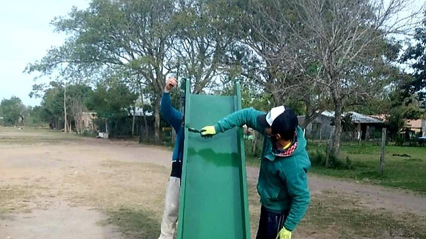 Personal municipal de Paso de la Patria trabaja en la recuperación de los juegos de la plaza de la Chacra 41.