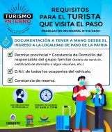 La Municipalidad de Paso de la Patria informa que para ingresar a la localidad se debe gestionar el Permiso para Turismo Interno al que se deben agregar: una constancia de domicilio o boleta de servicio que documente la residencia del solicitante, D.N.I. en mano de todos los ocupantes del vehículo y la constancia de reserva.